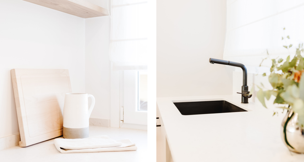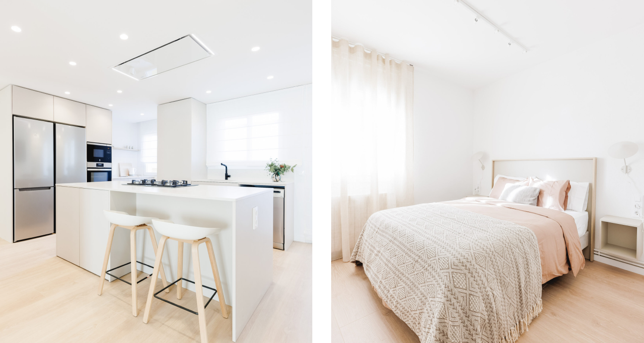 Projecte de reforma integral on convertim la cuina com a centre neuràlgic de l’habitatge, ja que els clients son uns amants de la cuina i de compartir amb tots aquells convidats el que hi preparen. L’hem obert tant al que abans era el passadís com també hem guanyat espai enderrocant la paret que la separava d’una habitació traster. També hem millorat la funcionalitat i l’accés a l’espai de rebost. També hem renovat el bany i, aprofitant la benentesa, hem substituït la banyera per un plat de dutxa. Li hem aportat més funcionalitat i amb el mirrall rodó aconseguim ampliar-lo visualment. A més, les tonalitats suaus ens ajuden a convertir-lo en un espai de benestar. En quan al dormitori, el canvi ha estat a nivell de mobiliari i pintura, canviant els colors foscos per blancs i pastel. Això combinat amb uns tèxtils en tons càlids, fan que l’espai es vegi transformat i sigui agradable.