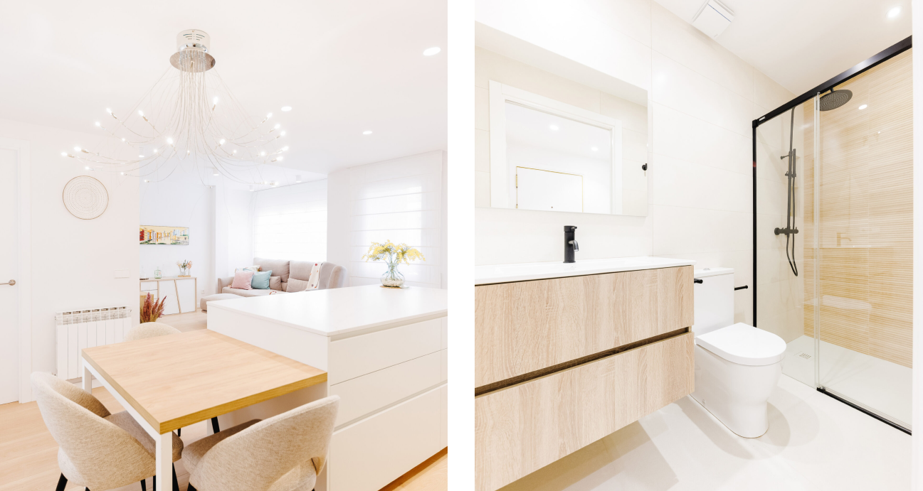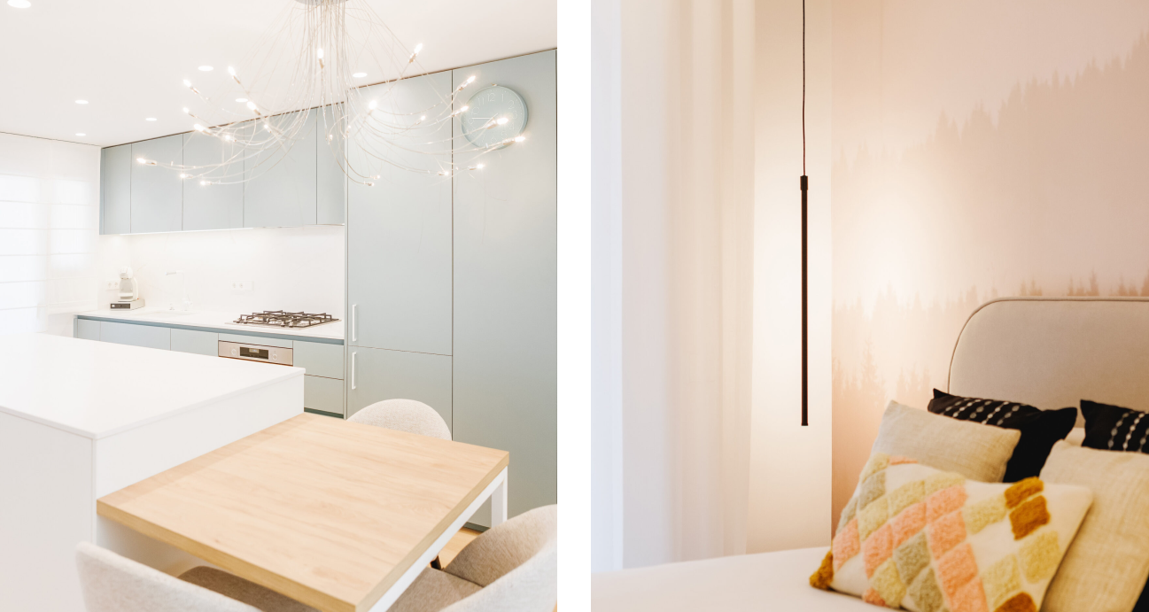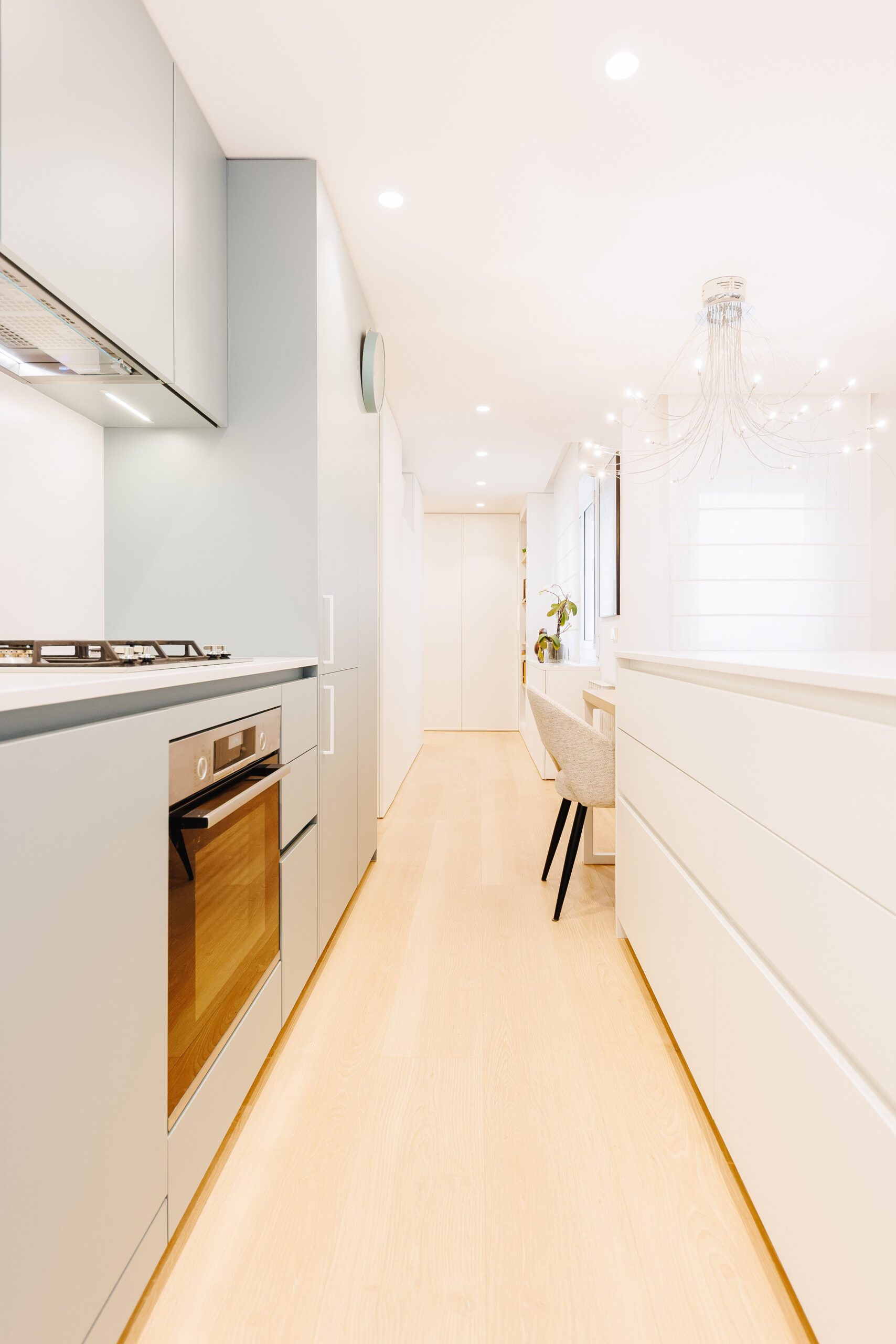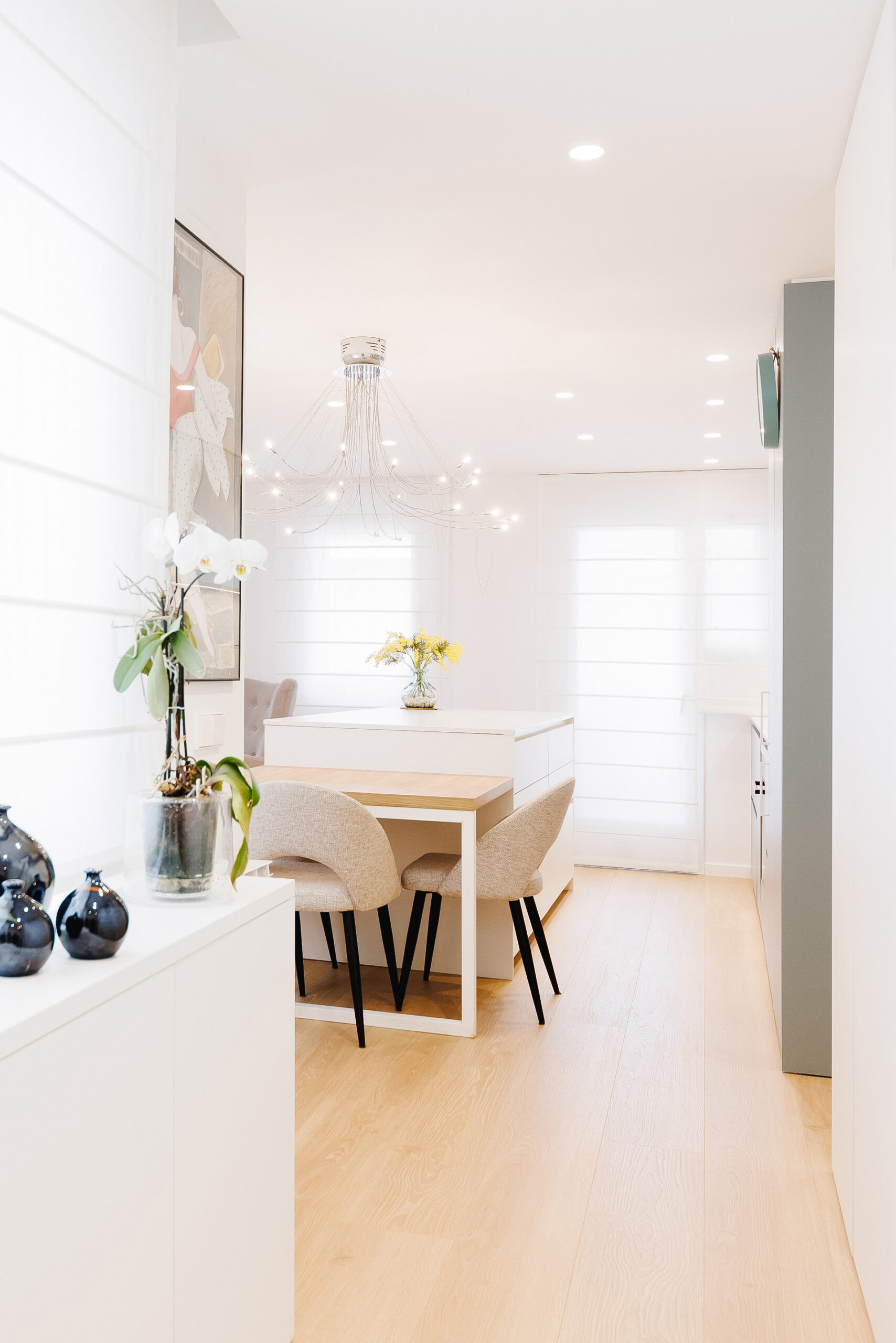 Projecte de reforma integral on la premisa principal era canviar la distribució per obtenir un segony bany a l’habitatge. Al ser un pis, aquí és on hi havia la complicació, per tot el tema de baixants compartits amb veïns. És per això que vam enderrocar la majoria de parets de l’habitatge per tal de fer-lo molt més diàfan i també per poder usar armaris com a parets divisòries. La nostra clienta tenia molt clar que l’emmagatzematge era primordial per a ella, per això tot el passadís d’entrada fins a la zona d’espai obert de cuina-menjador-sala d’estar consta d’armaris a banda i banda. En quan als banys, vam aconseguir un segon bany col·locant-los d’esquenes un de l’altra. D’aquesta forma la paret que els dividia passava a ser una paret gruixuda per on redirigíem els desaigües. La nostra clienta és molt cuqui i tenia clar que volia el seu pis amb una base neutra i que ja la combinaríem amb tonalitats pastel per donar-hi el seu toc de color.