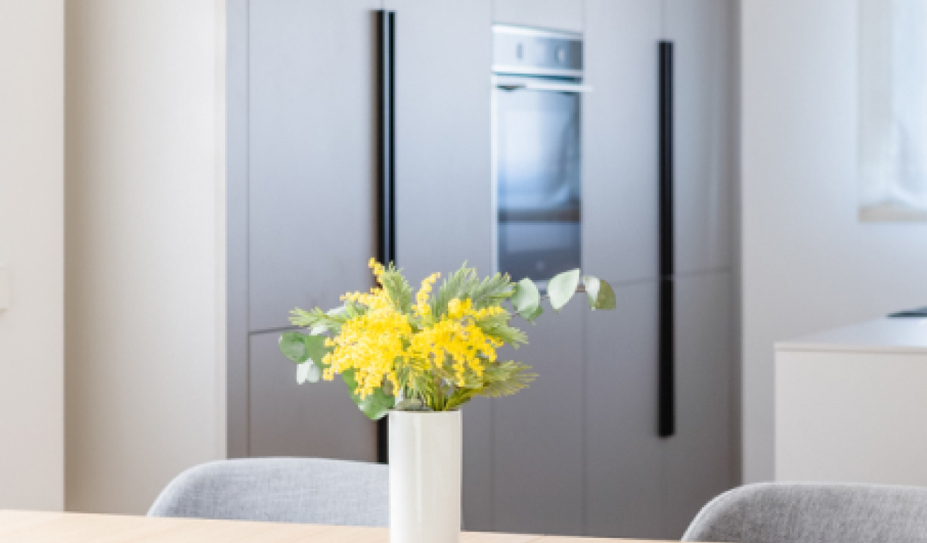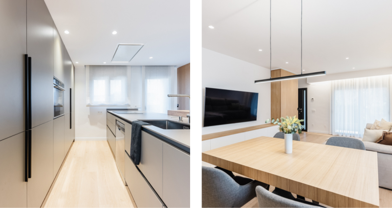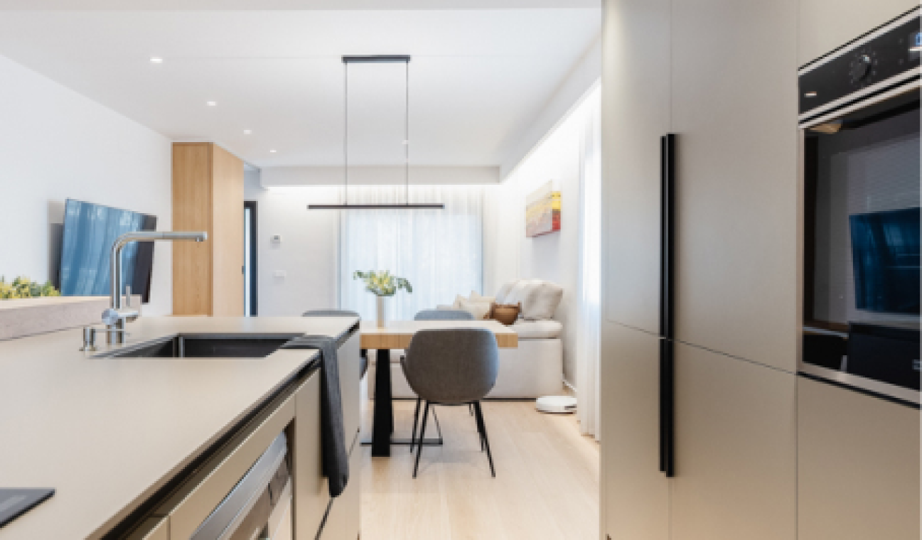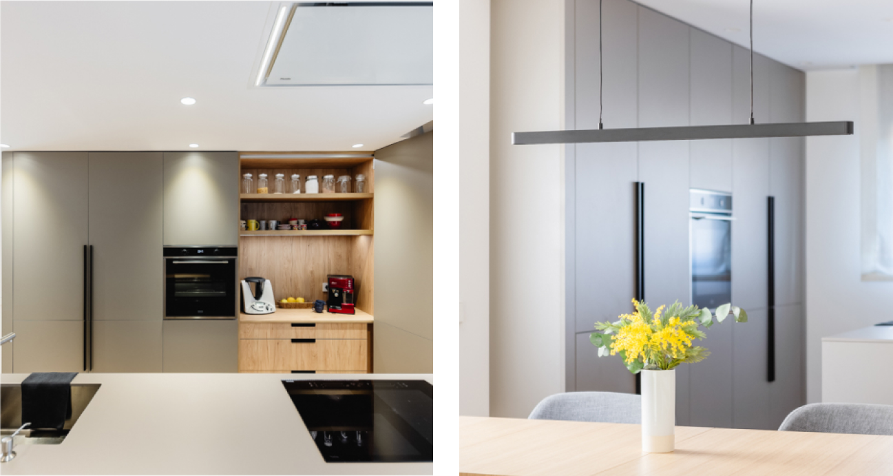 Reforma d´un espai de cuina adjacent a un saló menjador i entrada. El projecte ha constat de la unió de tots aquests espais en un de sol, creant un concepte obert a la planta baixa d’un habitatge. Vam fer el disseny a mida d’un moble amb triple funció: moble rebedor per guardar jaquetes, bosses i sabates, porta de pas per tancar temperatures, i alhora, també armari per a la zona del televisor. El menjador i saló, els vam fer en blanc i fusta, contraposant la zona de la cuina, amb un to argila que li dóna un toc càlid i elegant a l’espai.
