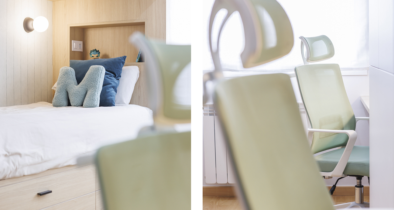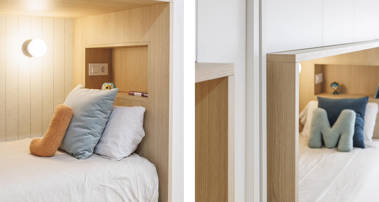 Projecte de reforma d’un dormitori per a dos infants, mitjançant mobiliari a mida. Es tractava de convertir el dormitori en un espai multifuncional en el que fins i tot es pogués dividir l’espai en dos perquè cada un tingués la seva pròpia zona. Un gran moble que conté dos espais de dormitori, amb emmagatzematge de total profunditat tant a la part superior com en la interior. També conté una porta corredera amb fusta i vidre que permet la divisió del dormitori en dos espais que mantinguin el pas de llum natural. Una de les dues zones també conté un llit niu per a convidats. Cada un dels infants té la seva pròpia zona d’escriptori i mobiliari per emmagatzematge d’elements propis del dia a dia de les seves activitats extraescolars. Amb aquest interiorisme hem aconseguit un nou espai de dormitori sense la necessitat d’obra.