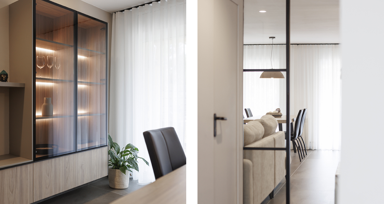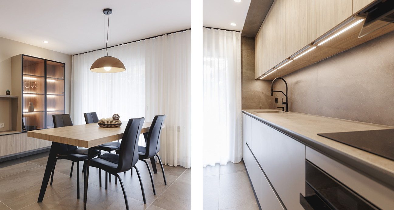 Projecte d’interiorisme per a la reforma d’una zona comuna d’un habitatge a La Selva, que vam dissenyar perquè es convertís en una llar amb estil. La zona de la cuina, menjador i sala d’estar, tenien una distribució especial que feia que tots els espais quedessin petits viusalment, tot encaixat, sense espai lliure que respirés. Amb la nova distribució, vam seguir tinguent la cuina a paret, però hem guanyat un espai de menjador i llum que ara fa que la zona es vegi molt més gran. A més, és una distribució molt funcional per a dies determinats poder celebrar amb la família o amics. El joc que permeten la mobilitat dels elements cèntrics, el converteix en un espai molt versàtil.