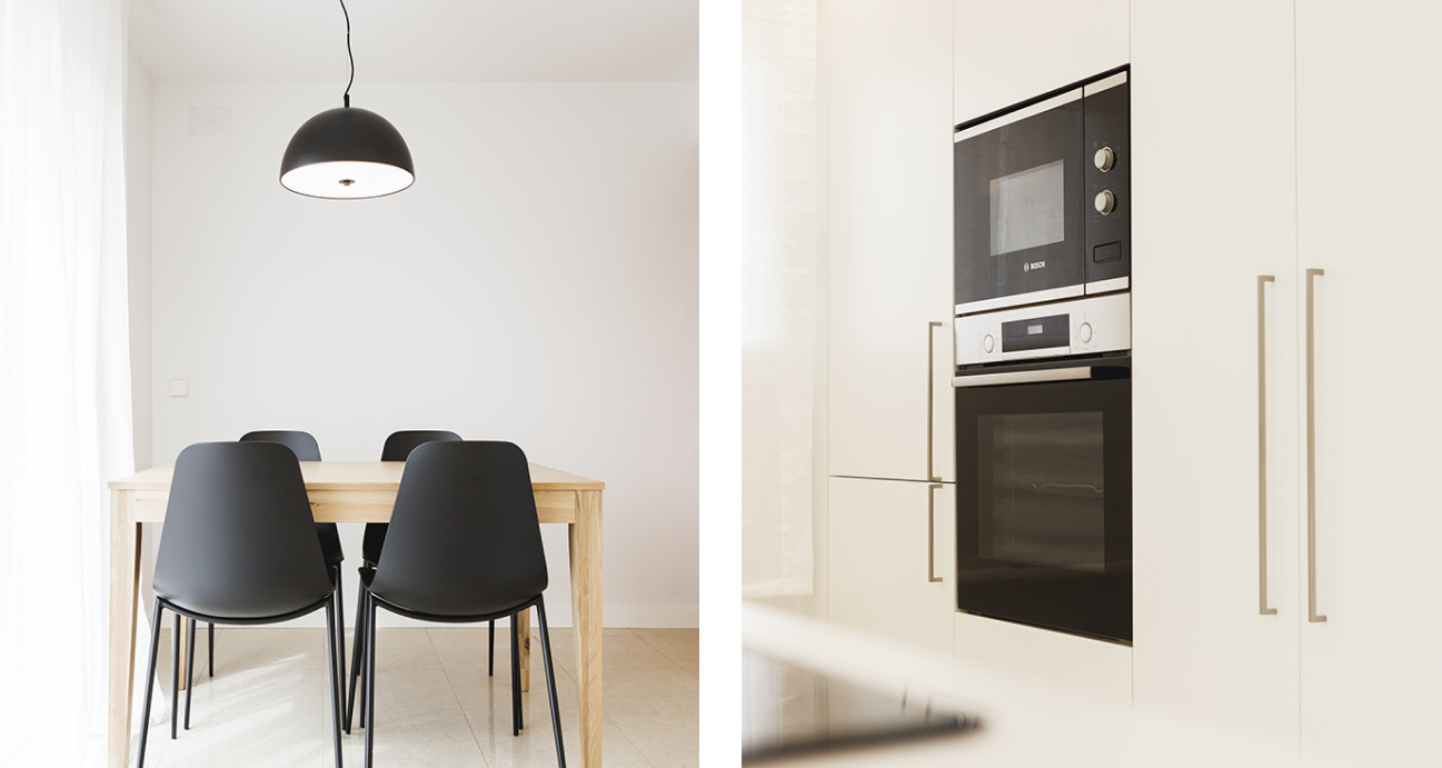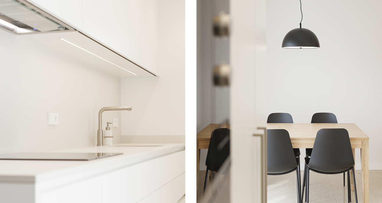 Projecte integral per una reforma amb lllum i amplitud d’una cuina i un bany suite. Es tractava de millorar els espais a nivell funcional, però també donar-los una estètica més actual i atemporal per tal que no passessin de moda. La cuina blanca, ara dividida en dues zones, permet aprofitar la totalitat de l’espai. Amb el seu acabat, permet una visió profunda de l’espai i fem més acollidor l’espai de menjador amb la taula en fusta i un toc negre. En quan al bany, l’eliminació del mur que era l’antiga mampara, ara un vidre transparent, fa que l’espai hagi guanyat llum alhora que profunditat.