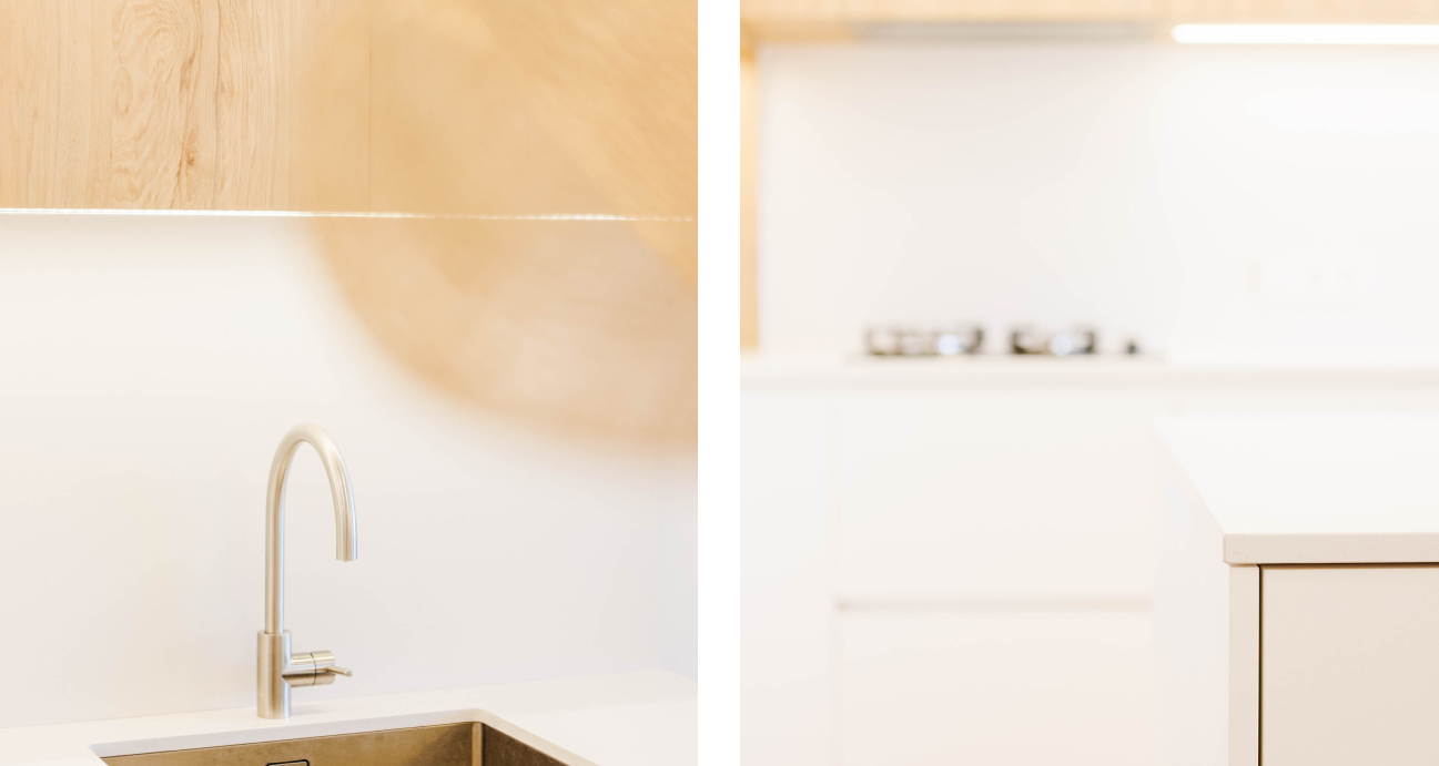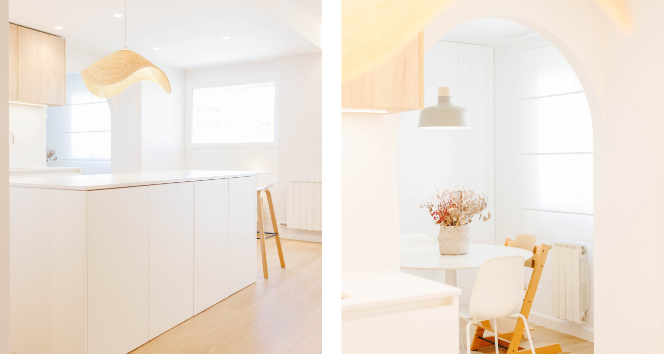 Es tracta d’un projecte de reforma integral de l’espai comú d’una cuina, menjador i sala d’estar. En un inici ens trobàvem les barreres divisòries i visuals de les parets que els separàvem. Des d’un inici vam tenir clar que aquests elements havien de desaparèixer per tal d’ampliar l’espai visualment i també poder reduir funcions duplicades i que la majoria de vegades no se’n feia un ús. Per això, vam unir la cuina i la sala d’estar convertint-ho en un gran espai, i ampliar el pas fins al menjador per tal de poder unir-lo visualment al màxim. A aquest últim li vam donar forma d’arc, fent-lo més amable en formes que el que era anteriorment. Amb aquests canvis hem aconseguit un nou espai que s’ha configurat com a nou cor de la família.
